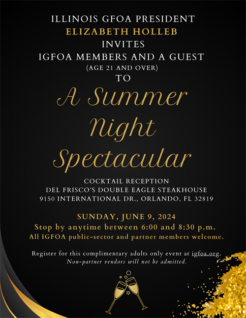 Register today for the Member Social Reception at the GFOA National Conference in Orlando, FL on Sunday, June 9, 2024. Enjoy appetizers, cocktails, and networking with your Illinois GFOA colleagues!