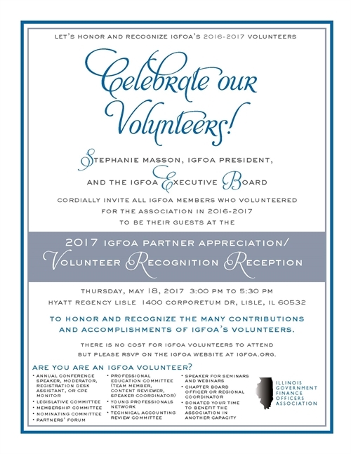 The IGFOA Executive Board cordially invite all IGFOA Members who volunteered for the association in 2016-2017 to be their guests at the 2017 IGFOA Partner Appreciation/ Volunteer Recognition Reception.